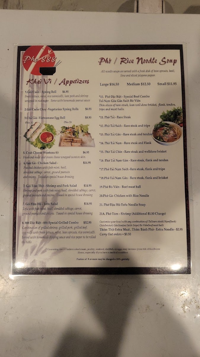 Nestled in the vibrant streets of Aurora, Colorado, Pho 888 offers a delightful gateway into the rich world of Vietnamese cuisine. Located at 539 Sable Blvd, this charming eatery creates a warm and inviting atmosphere, making it a favorite among locals and visitors alike. With a commitment to fresh ingredients and delightful flavors, Pho 888 stands out as a beacon for pho lovers and casual diners who are in search of hearty meals that won't break the bank.